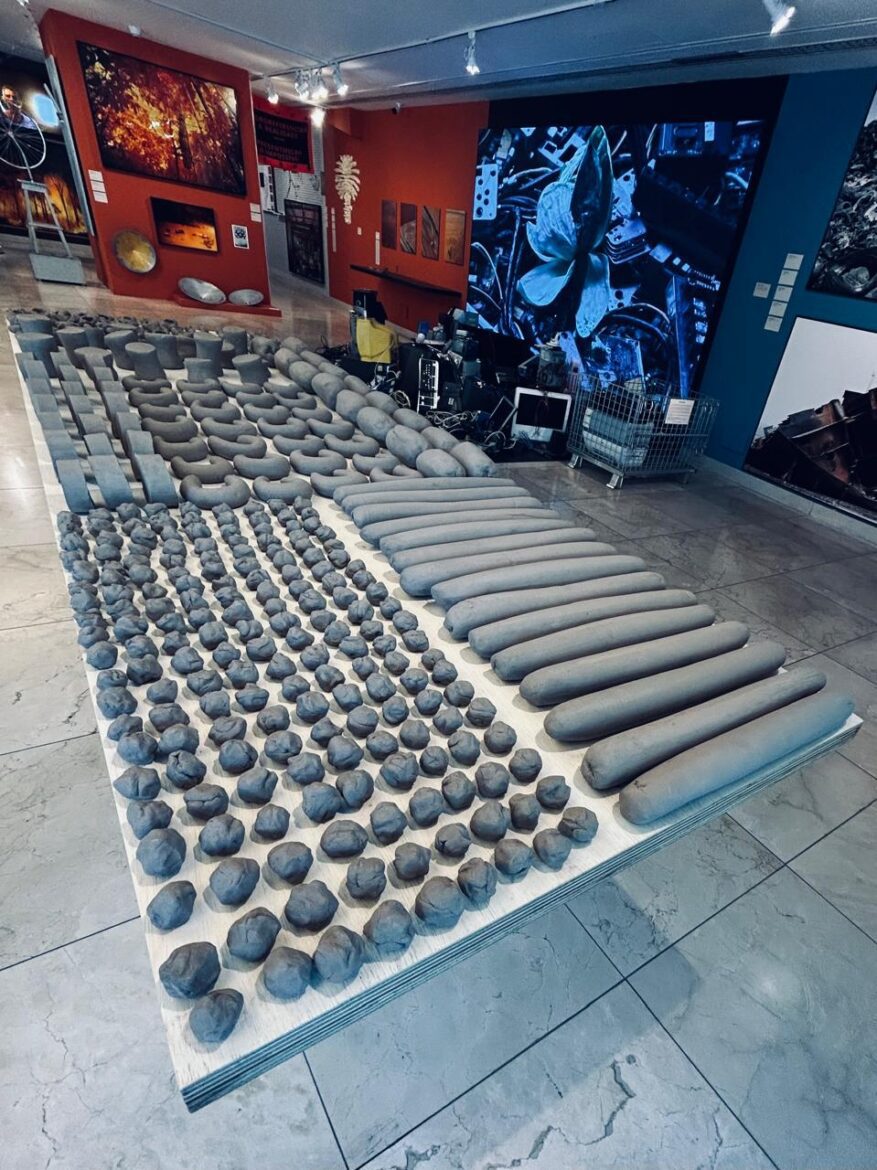 É modesta, pequena, mas para quem a conhece, deve ter sentido o mesmo bater intenso da pulsação. Sim, ao vivo em muitos tons de cinza a obra Estudo para uma instalação, bem ali, ao lado, dá para sentir cada milímetro. Executada em 1993, chega a 2025, quando reativada. Assim se entende sua datação (1993 – 2025), espaço tempo que vai sendo alargado em obra, coisa bacana da arte contemporânea. Entre tantas outras instalações midiáticas e obras multicoloridas, como podem ver, se alçam as pequenas peças de um fazer manual arcaico, italianíssima produção das massas que Ana traz para abstrair por formas em série, mas sem deixar de acionar a fome, das agruras femininas, do labor para sustentar a vida.