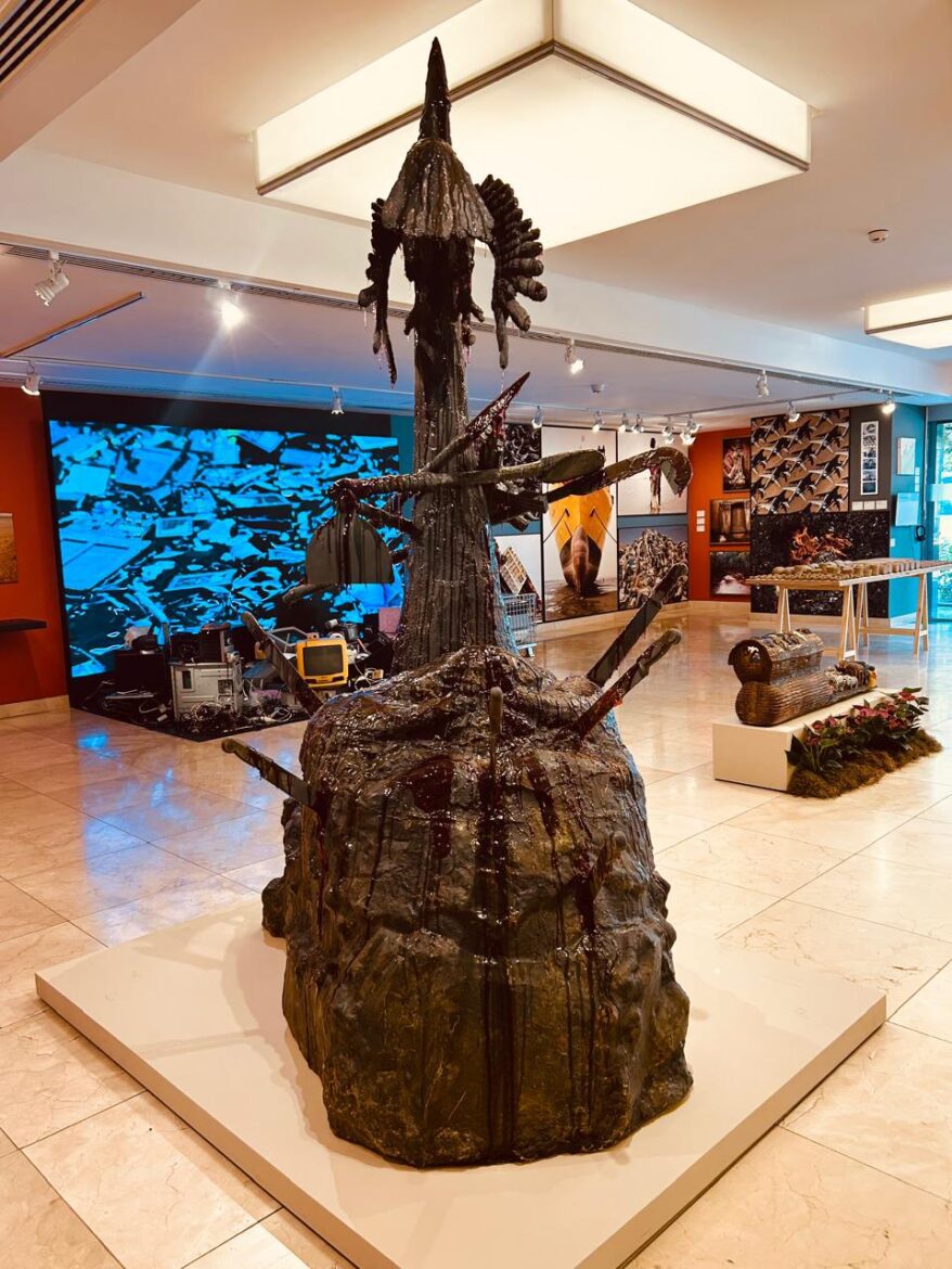 E, se vamos ao mais surpreendente, temos o assentamento para Ogum de Thiago Martins de Melo. Impressionante escultura de 260 x 130 x 170 cm feita de fibra de vidro e coberta de resina escurecida, pintada com um cinza chumbo escuro, denso, com fios de um vermelho escorrido desde o topo, como se ali muito sangue tivesse sido derramado. Traduz o universo de encantamento das raízes africanas no clamor à divindade da guerra: Ogum, Guerreiro para as lutas do Sul Global de cujo poder precisamos urgentemente. É belo esse escorrido vermelho fulgurante que desce por todo o corpo da obra, imagem das forças sagradas que pedem vida. Reconhecemos a pá, as facas, a ave sacrificada, o sangue em ritualística evocação. Os deuses também desejam, querem provar.