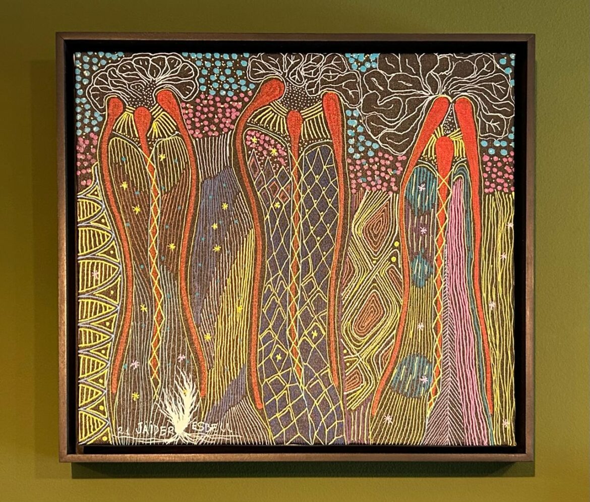 E claro, tendo Krenak na curadoria, vemos muita arte indígena. Trouxe aqui o prodigioso Jaider Esbell, pintor macuxi que faz parte da geração de artistas indígenas contemporâneos, marco na superação de barreiras gigantes entre nossas culturas. Infelizmente, perdemos Jaider em 2021, mas ele nos deixou um legado fecundo, estupendo. Temos aí uma beleza que eu não conhecia. Meus olhos ardem, é picante como damorida (sopa macuxi de peixe e pimenta ou melhor, de pimenta e peixe… rs). E muita saudade, observei que esta é uma de suas últimas pinturas. Éramos amigos. Nesse momento Jaider pintava os seres encantados, os terríveis Kanaimés e outras criaturas míticas. São seres que vivem no espaço de outra dimensão e tem imenso poder. Essas obras são imagens-encantamento. Clamam por justiça e defesa das terras indígenas, requerem poder. Traço característico da produção de Jaider, constante no vínculo à cosmologia macuxi e às noções de corpo expandido, espírito e floresta-sideral. Aqui a tela nos traz A Floração da Samaúma. A árvore gigantesca, a maior da floresta. Só quem esteve sob uma potestade dessas na florada sabe o que é a chuva dourada, na descida em giro de suas pequeninas flores, estrelinhas que vão pouco a pouco desenhando um tapete na sua base e, com isso, veja o encanto: se pode sentir a dimensão do diâmetro de sua copa. Sabe onde tem? No Jardim Botânico do Rio e, pertinho do chafariz central, fica uma enorme.