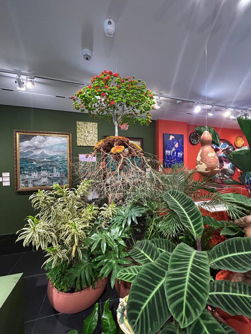 E, para não fazer spoiler de toda a mostra, intensa e rica viagem ao mundo das formas exuberantes, vou deixando só o gosto de uma pequena seleção dessas maravilhas no meio de outras tantas mais. Entretanto, ainda, preciso dizer que não deixei de notar os atravessamentos no tempo que admitem um pintor moderno como Guignard a artistas expoentes, como Cristian Cravo, fotógrafo, quando cada um é tomado com aporte vigoroso. Esse é o tempo da arte. E outro aspecto: ali não temos não somente obras, em certos locais, como ilhas espalhadas pela galeria e hall, distribuíram muitas plantas, reduzidos ambientes de mata, microcosmos de salvação. Vejam ao fundo do registro fotográfico a tela sensacional que Guignard fez em Ouro Preto, talvez a mais bela dentre todas as suas pinturas. Divino.