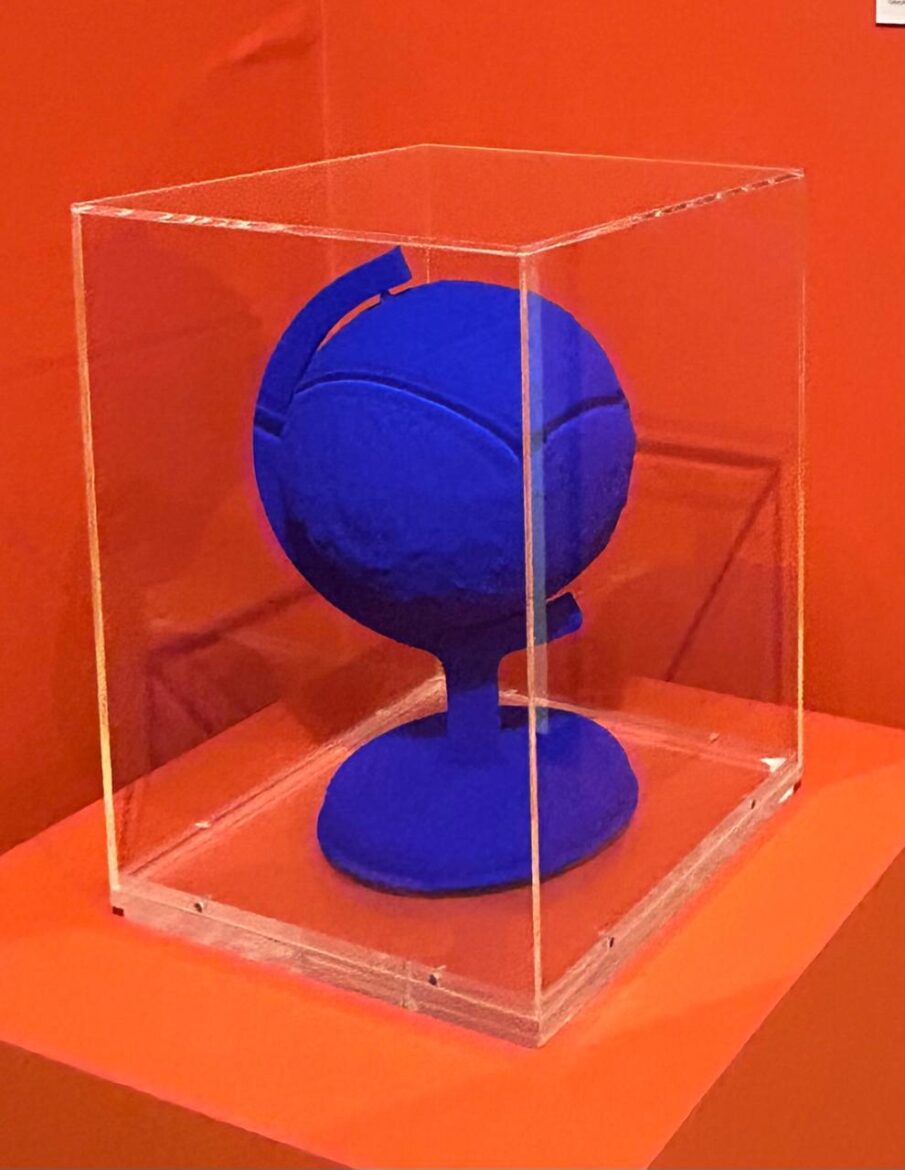 Agora vamos ao doce supremo, à A Terra Azul, de Yves Klein. Não sei se todos conhecem Klein, mas esse francês inventou uma cor – um azul – e saiu pintando por aí. O próprio azul é obra e, quando assimila alguma coisa, a transubstancia em algo além da ordem, a fazendo extraordinária. Tal é assim o globo que, sob esse azul fulgurante, nos traz a Terra, esse planeta azul de verdade. Está protegido dentro de uma caixa de vidro; aliás, é um acervo não declarado e, é mister notar, a obra vale uma fortuna. Vale mesmo. E vale, para nós, seus amantes, a viagem ao Rio para vê-lo. Klein chegou a patentear a cor, denominando-a IKB (International Klein Blue). Artista magnífico, criou muitas outras obras magníficas: a ele é atribuída a origem da performance, modalidade contemporânea de linguagem, experimentou a action painting, a abstração plena com admissão do vazio como matéria, a arte impressa conceitual, com notícias em jornal. E mais, e mais … No entanto, já temos o que exultar: o IKB já é todo um universo.