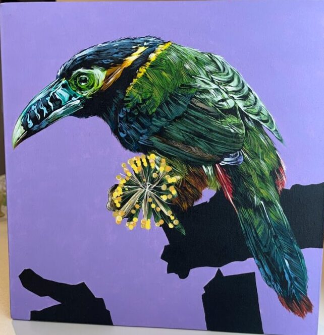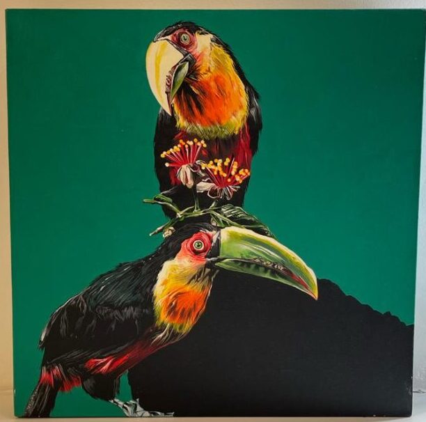 O conjunto de obras apresentado no jantar é protagonizado por figuras de pássaros, com destaque para os ranfastídeos, que se tornam metáforas visuais potentes. Com bicos curvos e cores intensas, essas aves operam como dispositivos de apontamento e espelhamento, evocando o retorno ao próprio corpo e à própria história. São imagens que tensionam identidade, linguagem e experiência, propondo uma reflexão íntima e, ao mesmo tempo, coletiva.