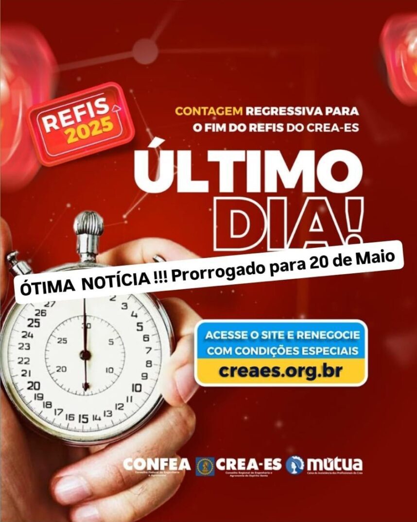O Conselho Regional de Engenharia e Agronomia do Espírito Santo (Crea-ES) prorrogou até o dia 20 de maio o prazo final para adesão ao REFIS, que permite a regularização de débitos com condições especiais. A medida foi adotada em razão dos feriados da semana passada e do alto volume de acessos às plataformas online, que apresentaram congestionamento devido à grande procura.