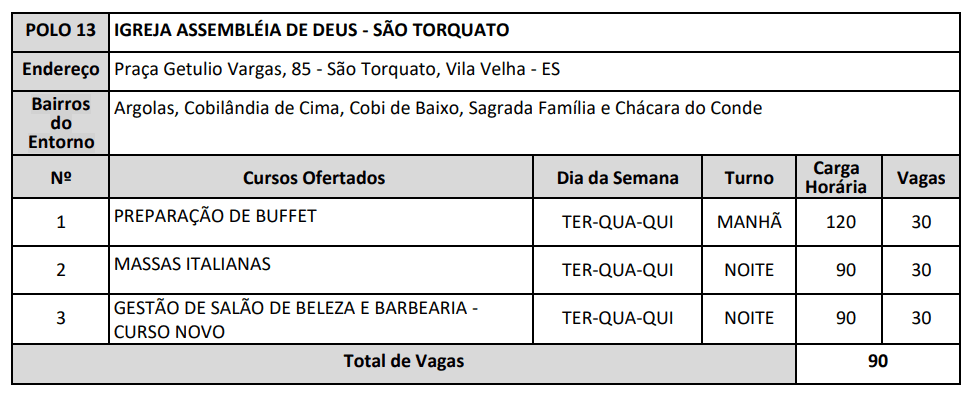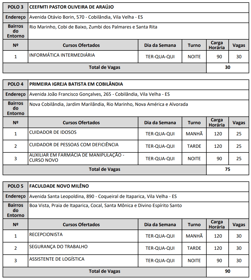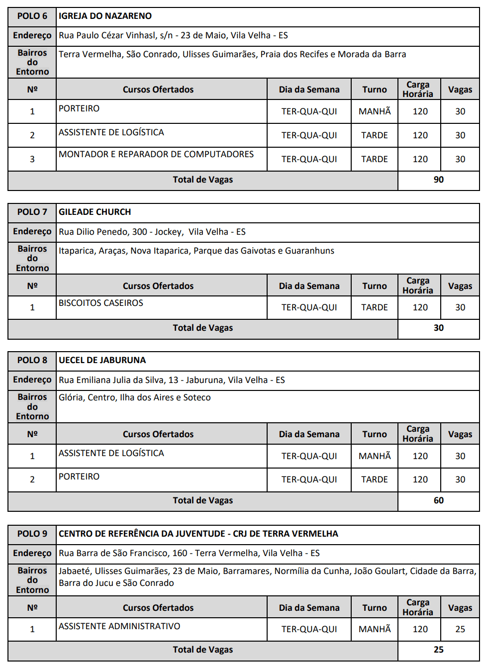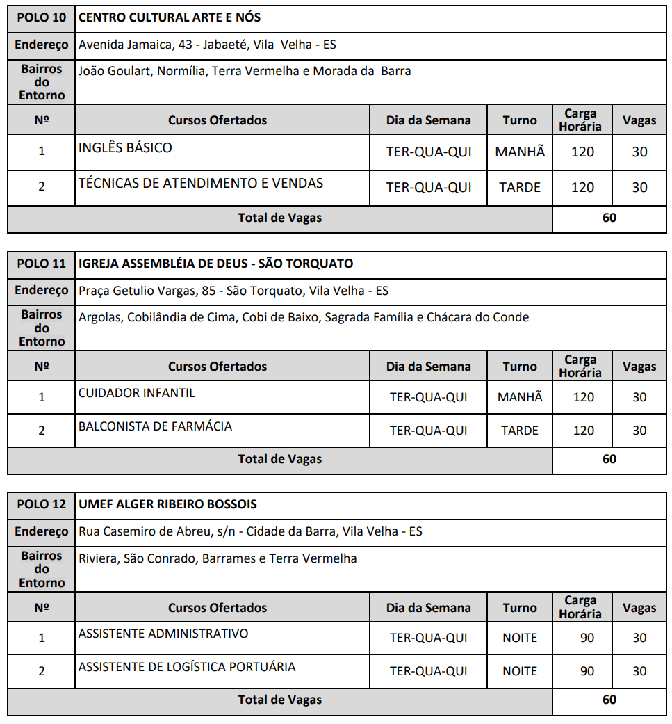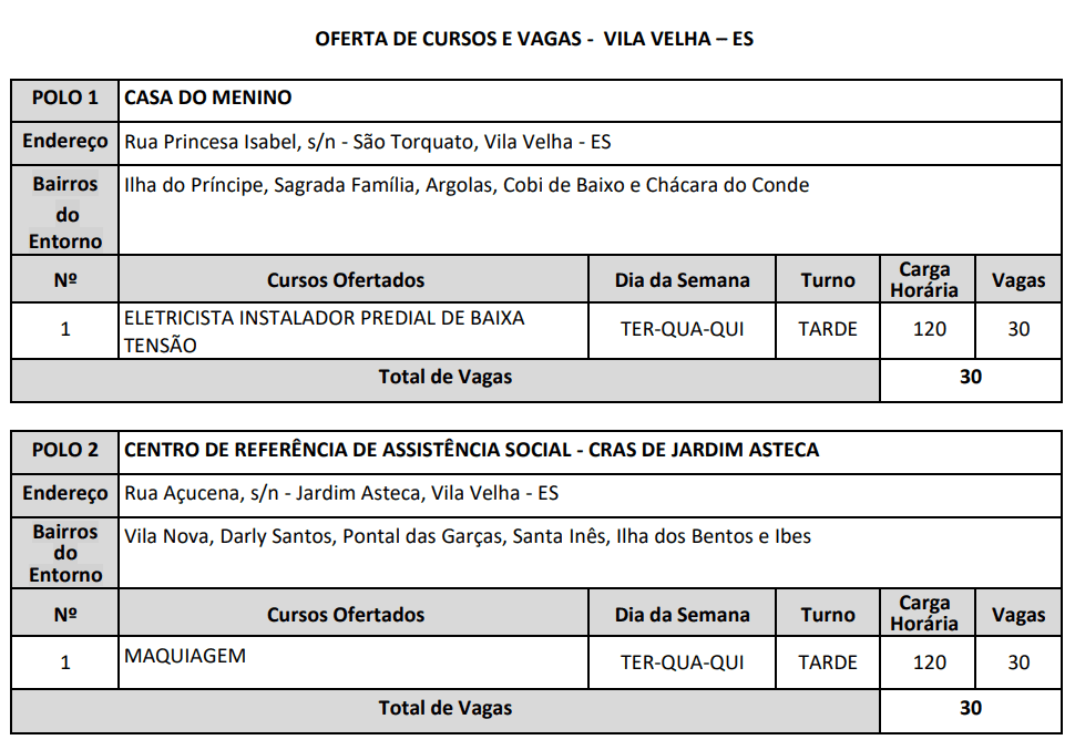 Este ano, os cursos a serem ofertados em Vila Velha, pelo programa “Qualificar ES”, são os de Eletricista; Maquiagem; Informática; Cuidador de Idosos; Cuidador de Pessoas com Deficiência; Auxiliar em Farmácia de Manipulação; Recepcionista; Segurança do Trabalho; Assistente de Logística; Montador e Reparador de Computadores; Biscoitos Caseiros; Porteiro; Assistente Administrativo; Inglês Básico; Técnicas de Atendimento e Vendas; Cuidador Infantil; Balconista de Farmácia; Assistente de Logística Portuária; Preparação de Buffet; Massas Italianas; Gestão de Salão de Beleza; e Barbearia.