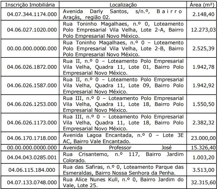 Foi publicada no último dia 11 de dezembro, no Diário Oficial de Vila Velha, a Lei nº 7.350/25, de autoria do prefeito Arnaldinho Borgo, que autoriza a desafetação e alienação de 12 bens imóveis em desuso, pertencentes ao patrimônio municipal, para que sejam destinados especificamente à expansão das atividades empresariais e industriais na cidade.